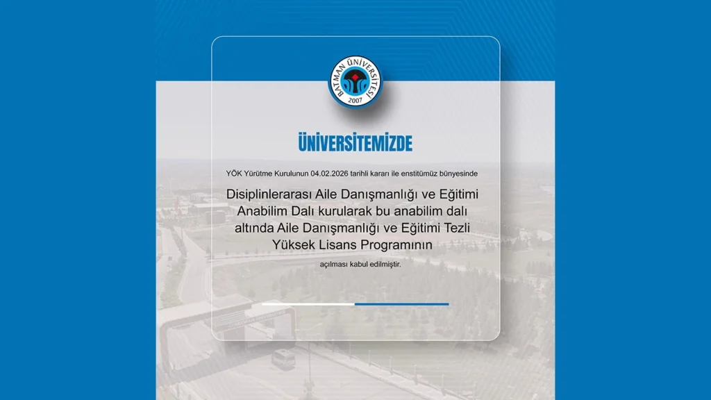 Batman Üniversitesi, eğitim alanındaki yenilikleriyle dikkat çekmeye devam ediyor. En son olarak, Yükseköğretim Kurulu (YÖK) tarafından onaylanan yeni bir programla, Aile Danışmanlığı ve Eğitimi Anabilim Dalı kuruldu. Bu gelişme, özellikle aile danışmanlığı alanında uzmanlaşmak isteyen lisans mezunları için önemli bir fırsat sunuyor.